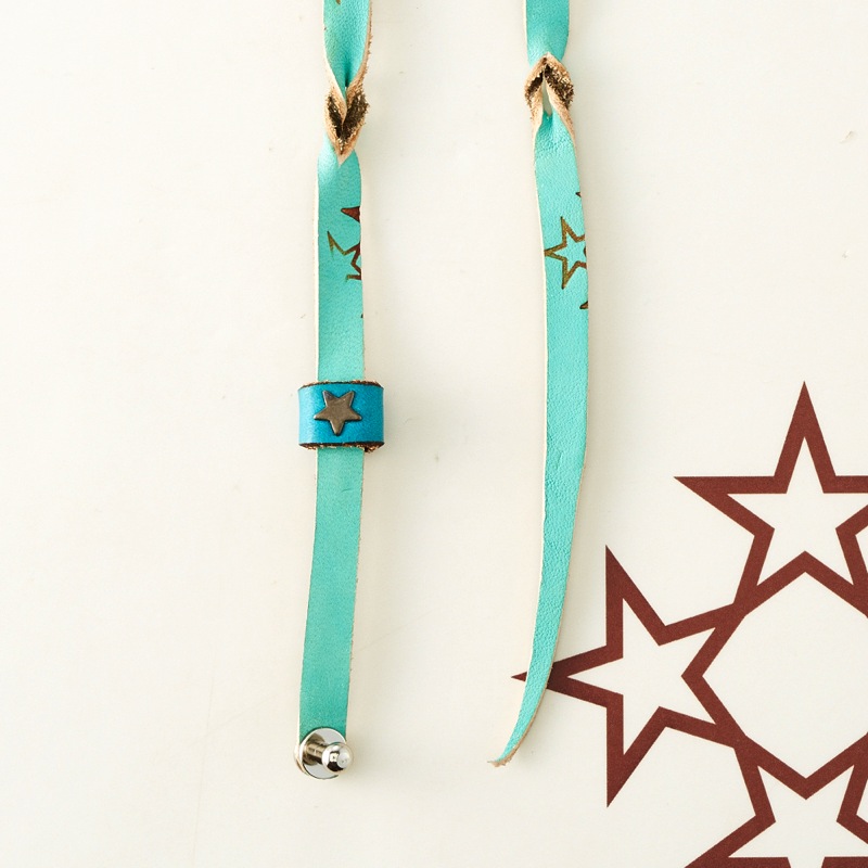 発色の良いレザーにオジャガスターの焼き印を施し、さりげない星スタッズがワンポイントになった二重巻きタイプのブレスレット。