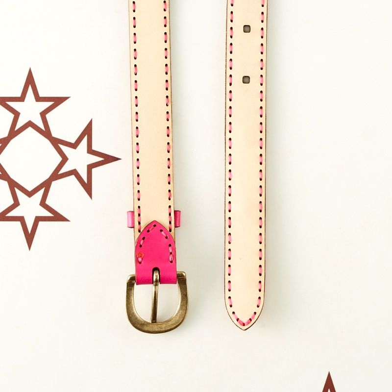 発色の良いレザーにオジャガスターの焼き印を施し、さりげない星スタッズがワンポイントになったベルトです。