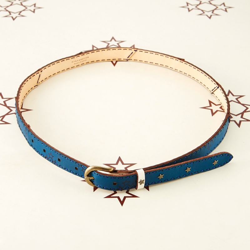 発色の良いレザーにオジャガスターの焼き印を施し、さりげない星スタッズがワンポイントになったベルトです。焼き印とスタッズのみのシンプルさを追求したデザイン。使い込むごとにしなやかさとツヤ感が増し、オジャガデザインのレザーならではの質感や経年変化をお楽しみ頂けます。シンプルな中にも存在感のある星スタッズがワンポイントになった、どんなファッションにも合わせやすい仕上がりです。