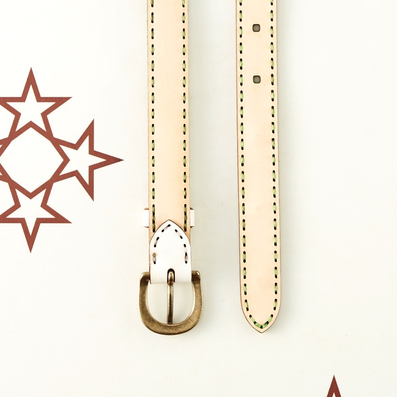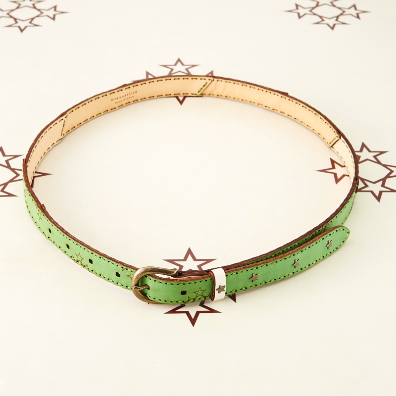 発色の良いレザーにオジャガスターの焼き印を施し、さりげない星スタッズがワンポイントになったベルトです。