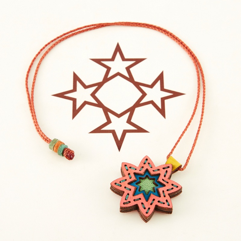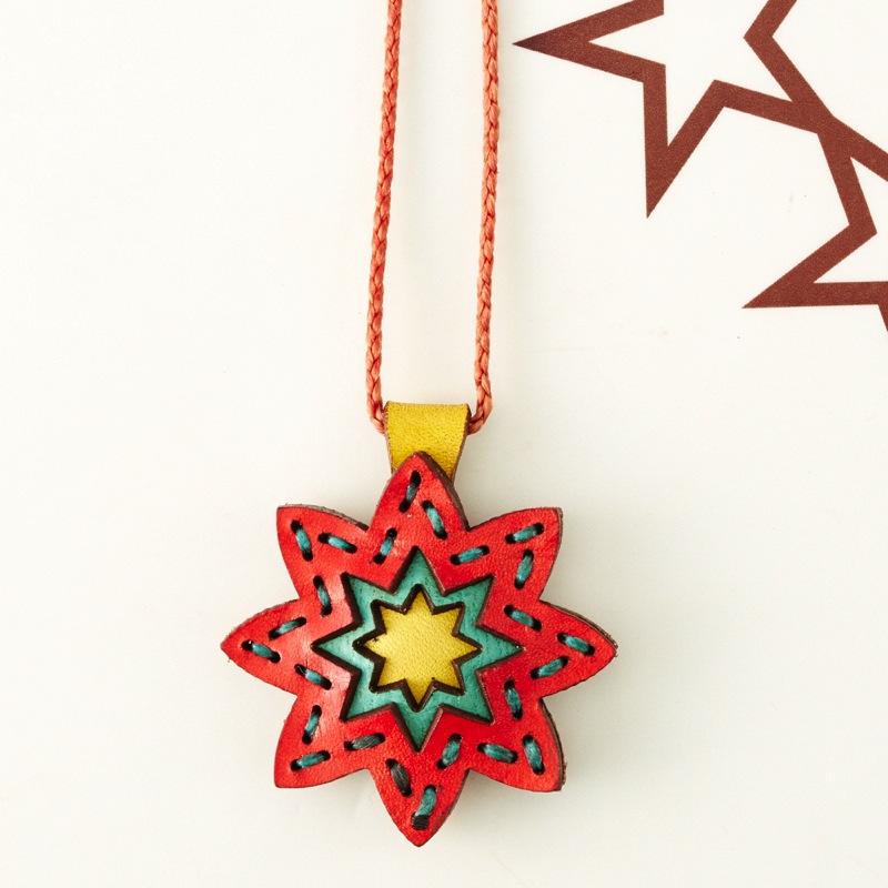 八芒星をデザインしたネックレスです。三枚の革を重ねた存在感のある仕上がりは、ファッションのアクセントに最適です。表裏それぞれ異なったカラーリングなので、リバーシブルでお楽しみ頂けます。紐部分のレザービーズで紐をお好みの長さに調整出来る仕様となっております。